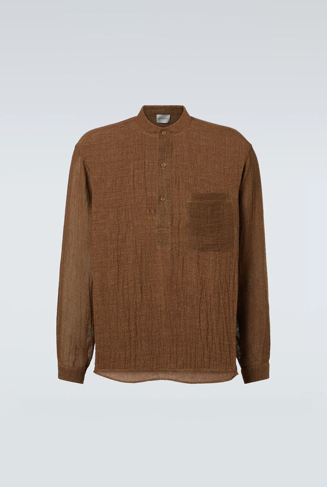 Made in a organic Italian linen gaz , naturally breathable and soft, that doesn’t wrinkle, the AMASA shirt has a oversize / relaxed look with a front pocket and a Mao collar / front nacre buttons.