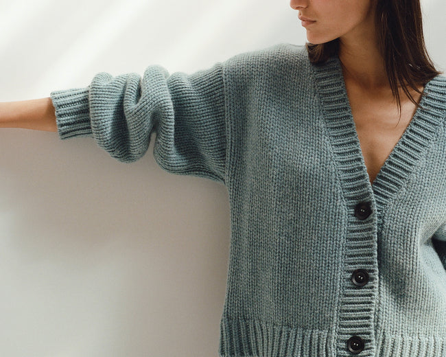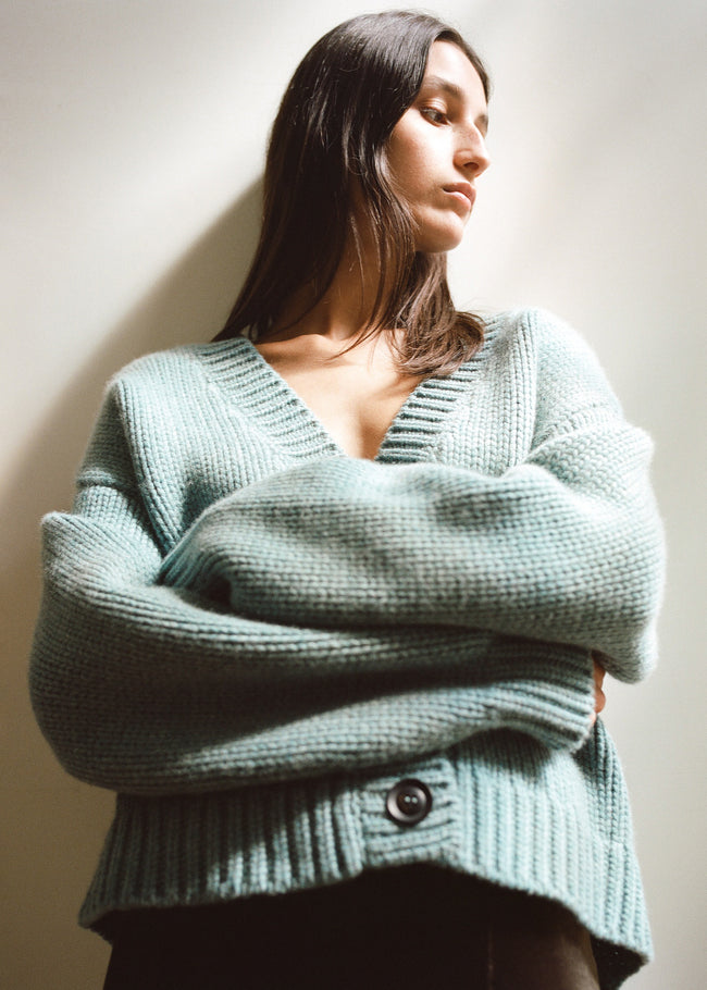 Made from a chunky and heavyweight cashmere. The KAMAL cardigan has a oversized and boxy shape with dropped shoulders and heavy rib hems.