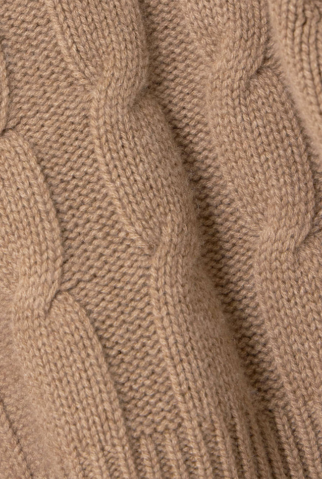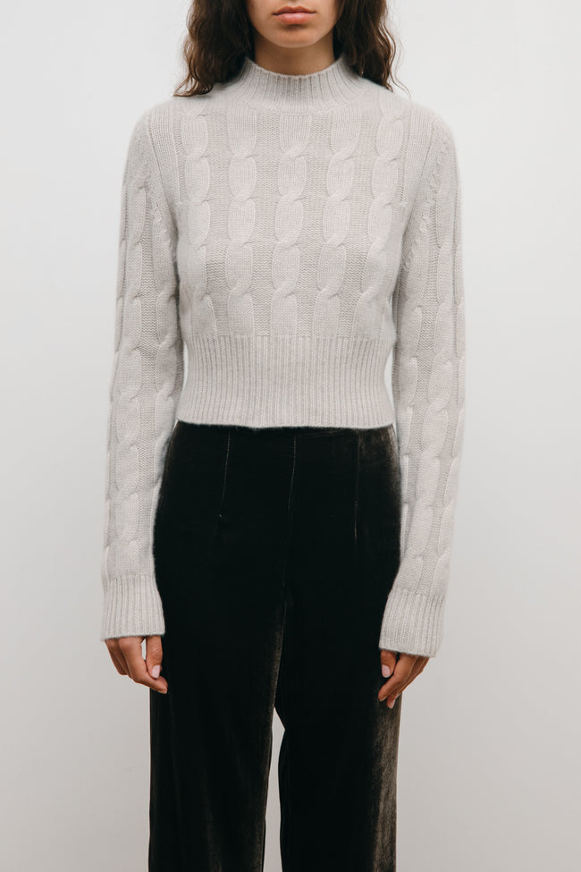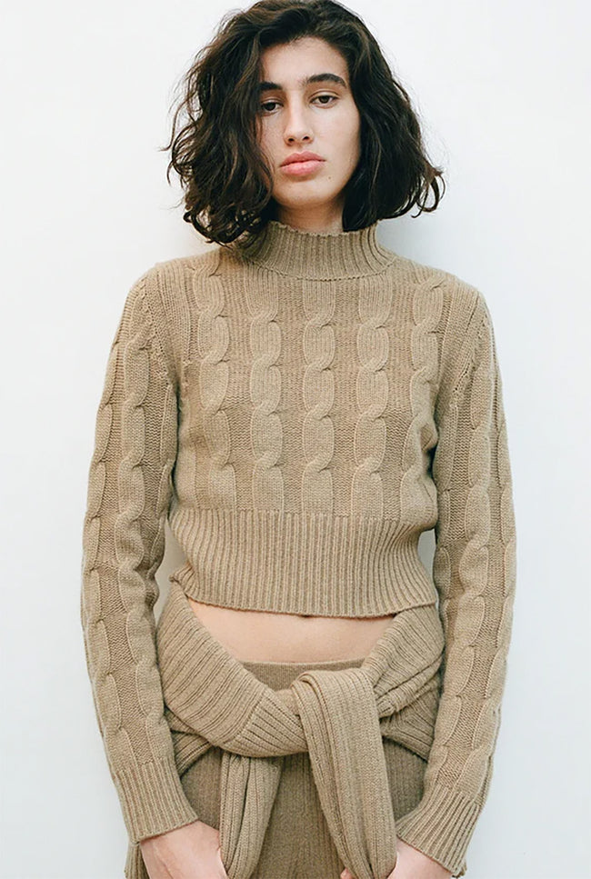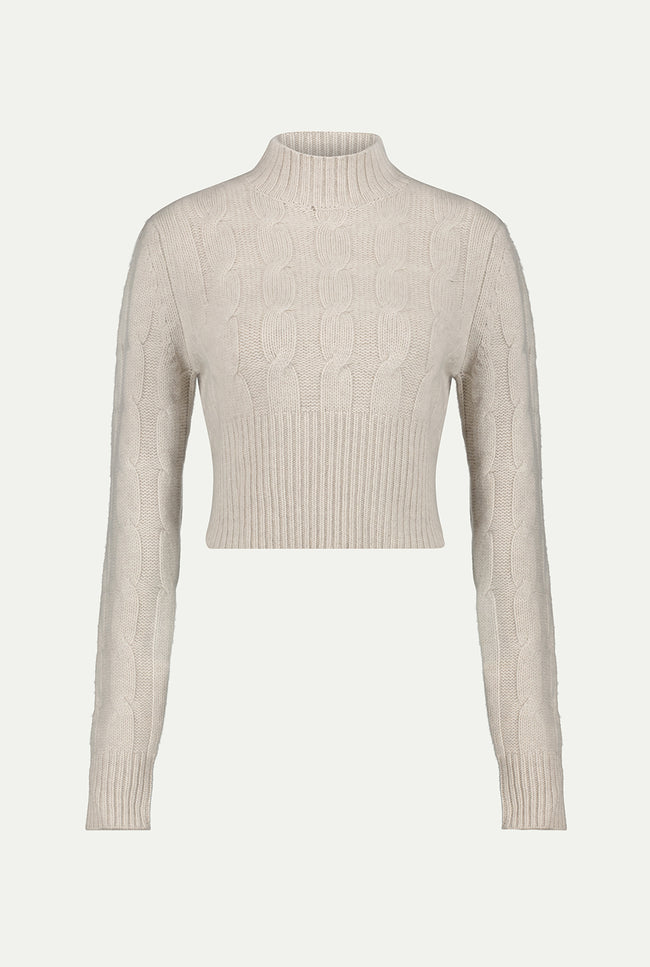 Knitted with braid-cables and ribs, the MURANO sweater has a fit silhouette with a mock neck .