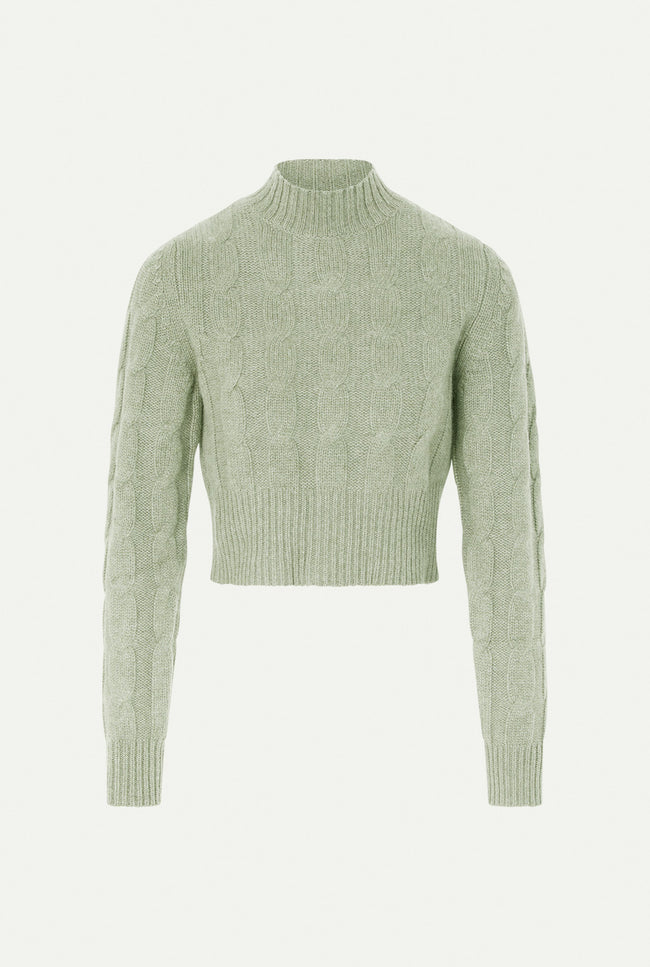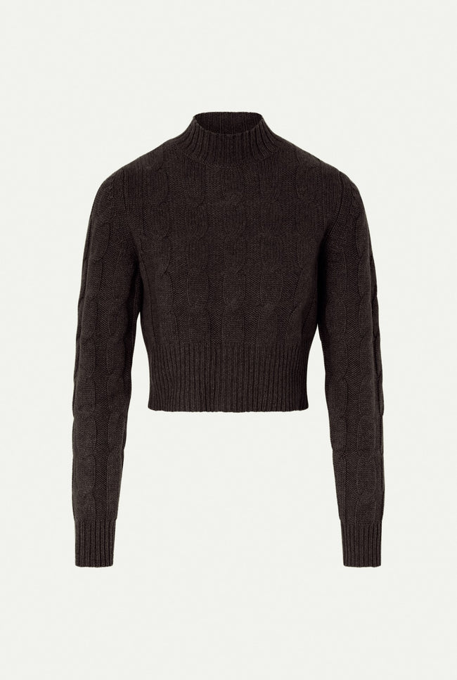Knitted with braid-cables and ribs, the MURANO sweater has a fit silhouette with a mock neck .