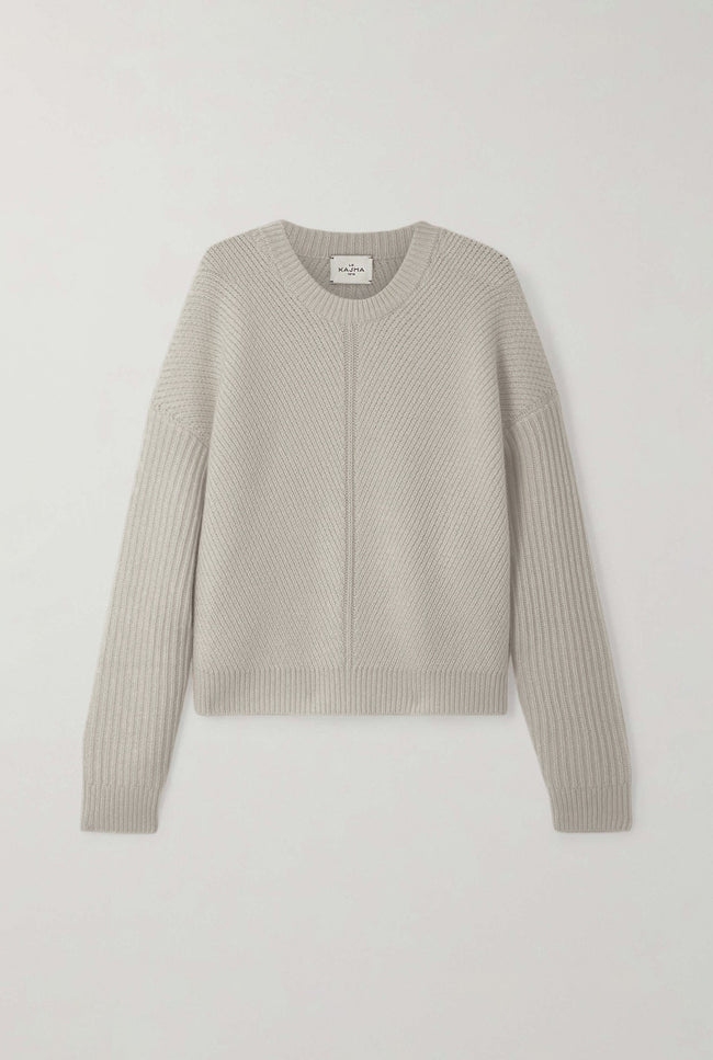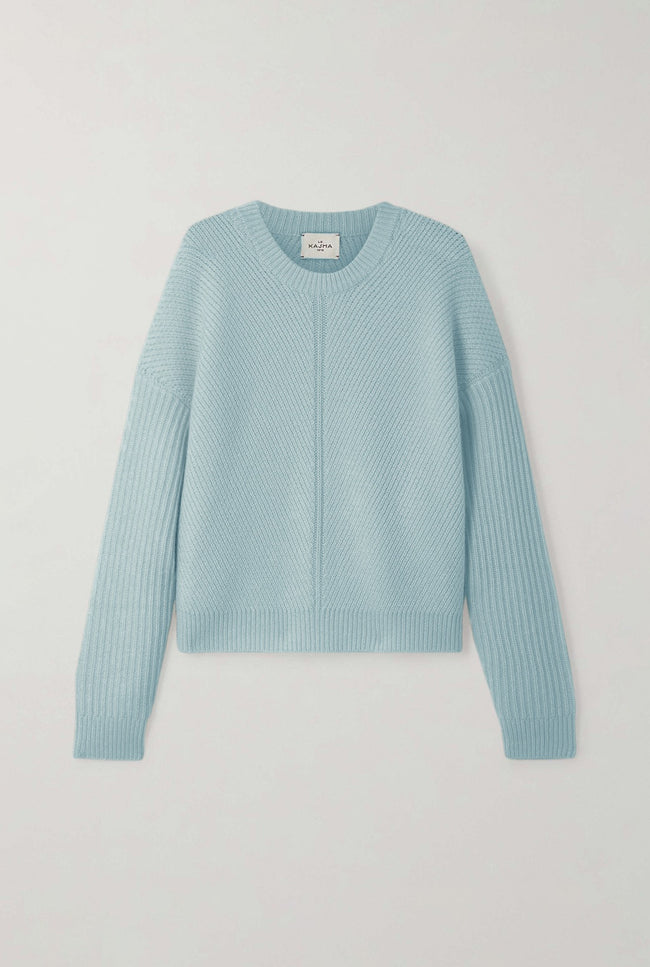 The PUGLIA sweater is made in a textured cashmere. Very soft. The shape is boxy with wide sleeves and dropped shoulders.