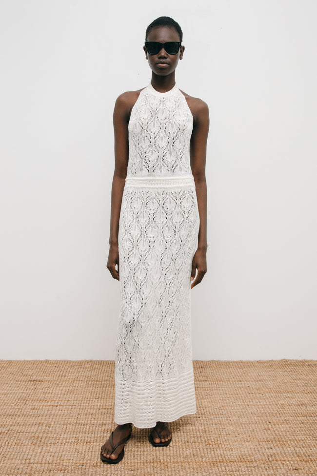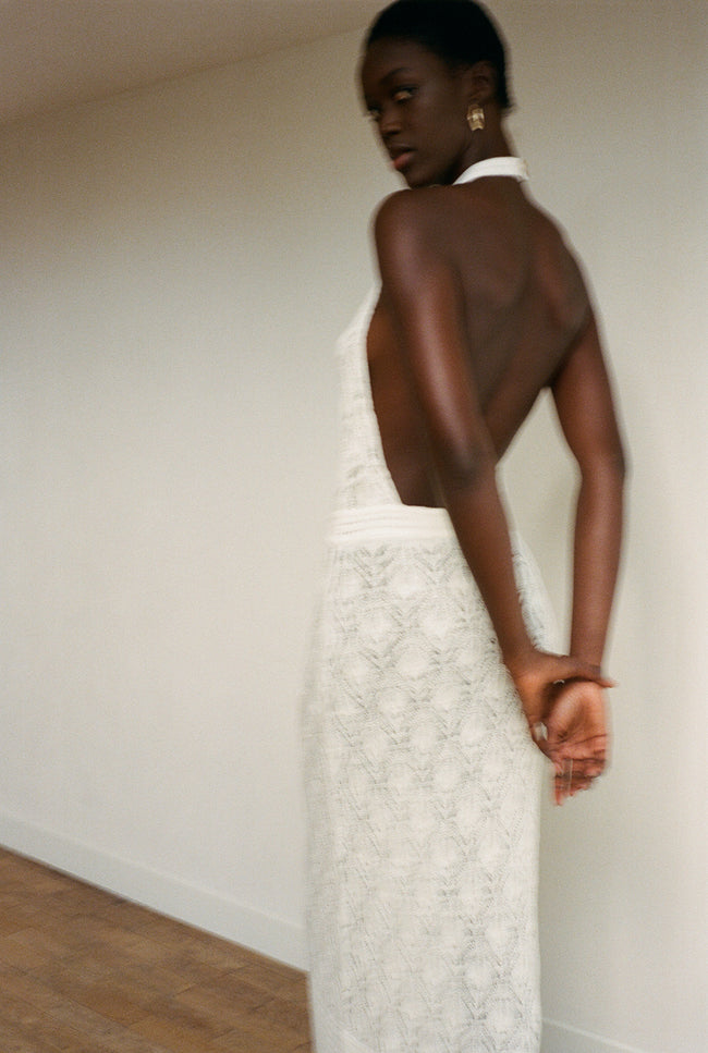 Crafted in organic linen knitted with our “losange pattern”, this special dress has a triangle top with a neck button closure and opened back that makes it a refined choice for summer outfit.