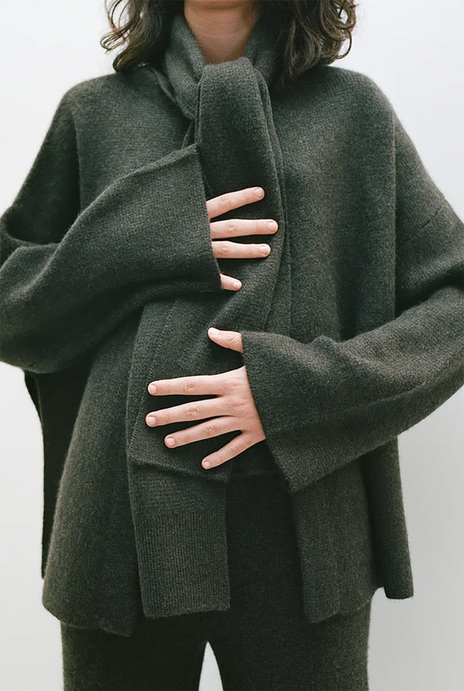 Made from a heavy brushed and compact cashmere , the SPAIN cardigan is cut for a oversized fit with a shawl high neck that can be closed with a discreet snap button.