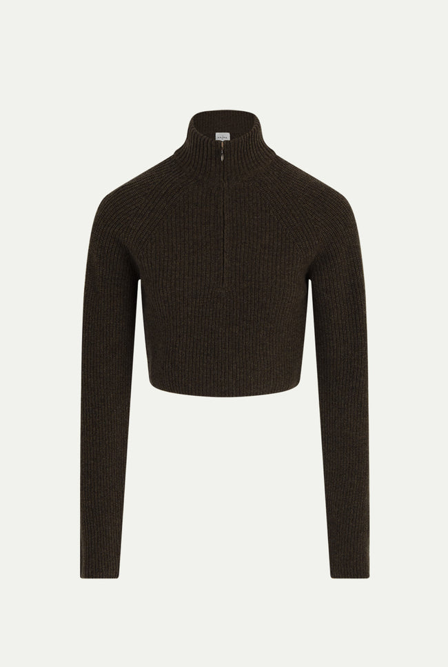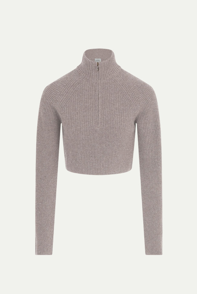 The TIBOLI sweater is knited in a compacted ribbed cashmere. It has a fitted body, cropped cut , and long sleeves. Designed with a mock neck and a half front zipper for more comfort; to wear with your hightwaisted bottoms