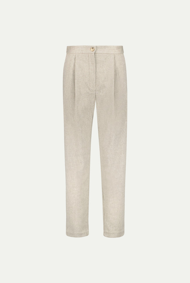 Tailored with front pleats, Uri pants is designed to sit on the waist and fall loosely.
