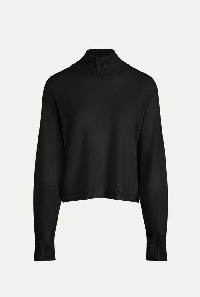 Finished with a ribbed mock neck and cut for a relaxed fit.