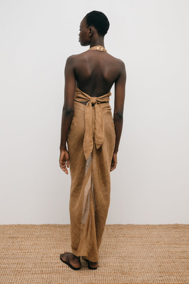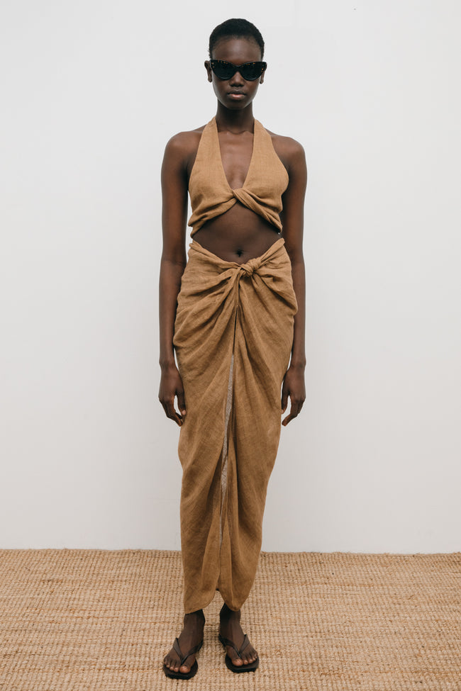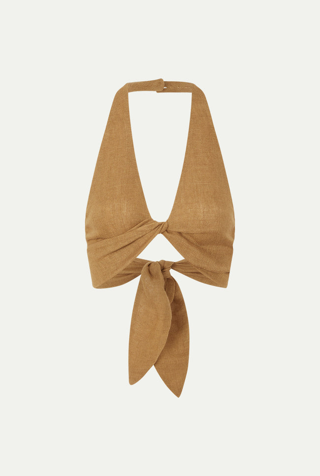 Made in a light and soft Italian linen, the ZAFAH top has an open back with a neck button closure and a back knot.Finished with a twisted and low cut front.