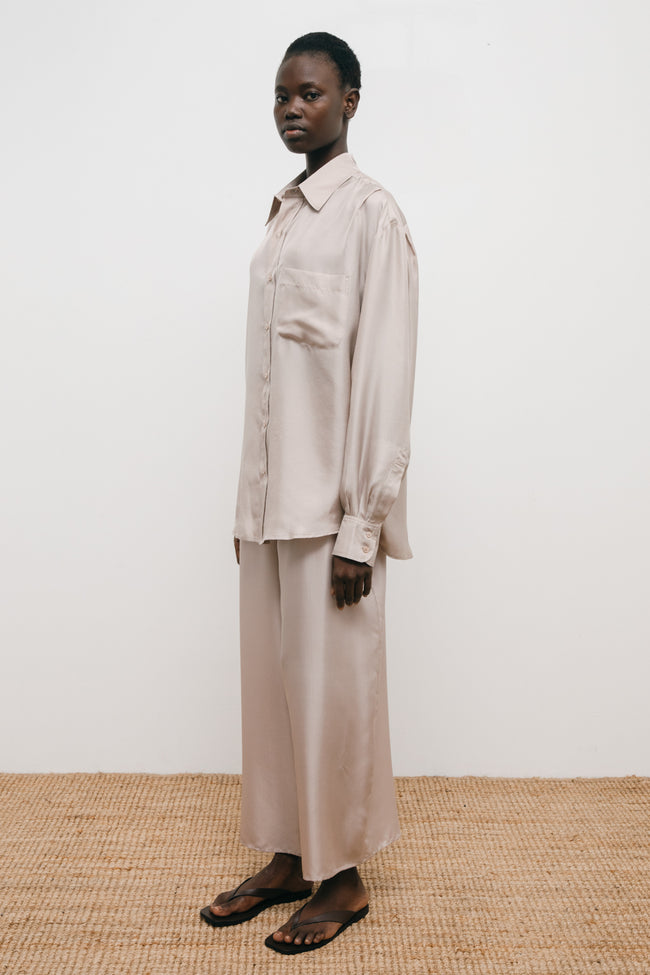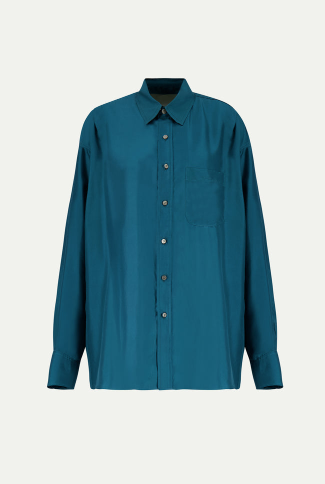 Crafted in high quality Italian silk, The Zagora silk has a oversized fit with relaxed long sleeves , a pointed collar and front pocket.